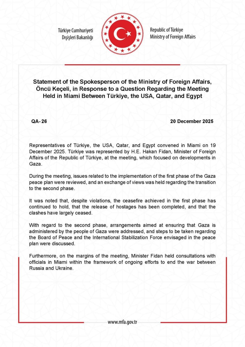 Turkey confirms Miami talks on 'TRANSITION' to Phase 2 of Trump’s Gaza plan
