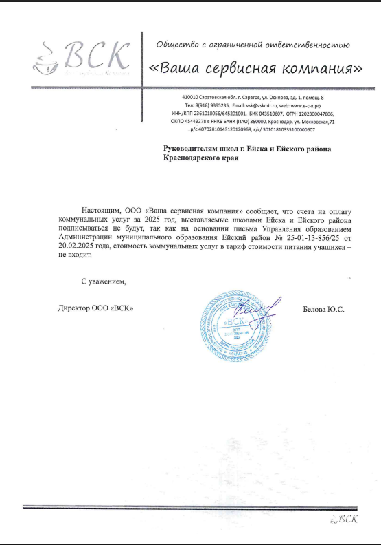 Речь пойдет о предприятии, которое кормит в школах детей, а именно ООО «Ваша Сервисная Компания», краткое наименование ООО «ВСК», директор Белова Юлия Сергеевна. Каким образом предприятие из Саратова, попало в Ейск?! В соответствии с данными из открытых источников, ООО «ФОРМУЛА ВКУСА-РЕГИОНЫ» предприятие, которое ранее кормила детей в школах , директор которого был Лыбзиков М.В., приобрело нового учредителя, а именно ООО «ВСК», а потом путем реорганизации в форме присоединения, ликвидировалось. На каких условиях, нам не известно, да и не интересно. Но вот на что можно обратить внимание читателя, что в Арбитражном суде КК находится иск ИП Лыбзиковой Т.В. к ООО «ВСК» о взыскании задолженности более 2 млн. рублей. И в этом процессе ответчик ООО «ВСК» выкатил к Лыбзиковой Т.В. встречный иск, правда, с менее значительной суммой, всего 70 тыс. рублей. Почему я обратил внимание на это судебное дело?! Дело в том, что пока не понятно, за что Лыбзикова взыскивает с «ВСК» 2 млн. рублей, но вот обратно, в иске, где участвует истец «ВСК», речь идет о задолженности по оплате коммунальных услуг. Вероятнее всего речь, идет о коммунальных услугах в учебных организациях Ейского района, так как третьим лицом по делу проходит (барабанная дробь) … управление образованием администрации Ейского района. Почему я поднимаю эту тему?! В Ейском районе разразился никогда не виданный ранее скандал! По понуждению Ейской межрайонной прокуратуры, 25 (двадцать пять) школ подали иски в Арбитражный суд КК, к ответчику «ВСК» по взысканию задолженности по оплате коммунальных услуг и общая сумма исков составляет более 5 (пяти) миллионов рублей. Оппачки!!!! Так и хочется вскрикнуть, а как же так, мы докатились до такой жизни?! Депутаты района в августе этого года, были возмущены положением, бездействием ответственных лиц администрации Ейского района. Уже в августе было понятно, что чиновники управления образованием специально сорвали конкурс по определению предприятия, которые будут кормить детей. Попросту своевременно не подали документы. Пришлось главе района принимать политическое решение, с кем заключить временно прямой договор?! В нашей жизни случаются иногда совпадения. Вот такой «нежданчик» случился (далее барабанная дробь!) … с «ВСК». Оказалось, что все лето набирало штат поваров в школы, даже без оформления (цит.), представляете, конкурс сорвался, а несмотря на все долги перед школами за 22-23-24 и 25годы, часть которых уже списывается как «безнадежной к взысканию» (цит.) , глава района Бублик Р.Ю. именно своим перстом, указывает на эту фирму! Только ООО "ВСК", только им доверяю!!! Во как?! Сама директор «ВСК» не пришла в декабре к депутатам, чтобы прояснить ситуацию, а прислала мужа. Белов Антон Алексеевич народным избранникам дал понять, что им надо перестать рожи кривить, а ему им надо в ножки поклониться (образно), за то, что «ВСК» согласилось кормить детей! Они, не хотели, а начальник управлением образованием Браун Л.С. их практически заставила! Оказывается, дошло до брани в кабинете и Браун даже матом ему сказала «Заходите и работайте!» (цит.). Депутатам стало стыдно за свое поведение! О какой баланде из мыльной картошки, которую готовят детям, о каких гнилых овощах, горьком- рыбном и вонючем фарше, можно говорить такому уважаемому поставщику услуг, если надо за цветами бежать и испра