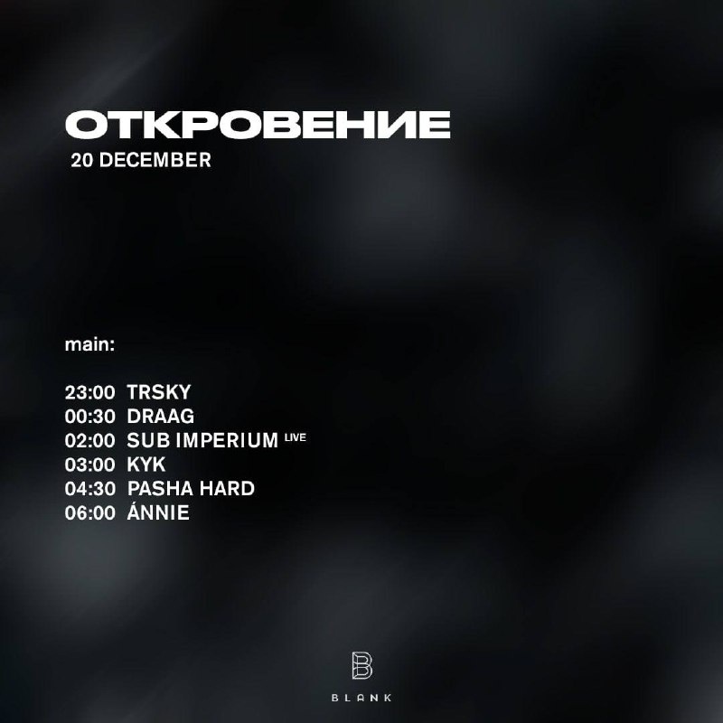 Откровение. Маст для почитателей его бескомпромиссности — техно! 🎫 Билеты: blankclub.ru 📆 20 декабря, 23:00 📍Blank, Санкт-Петербург, Арсенальная наб.1