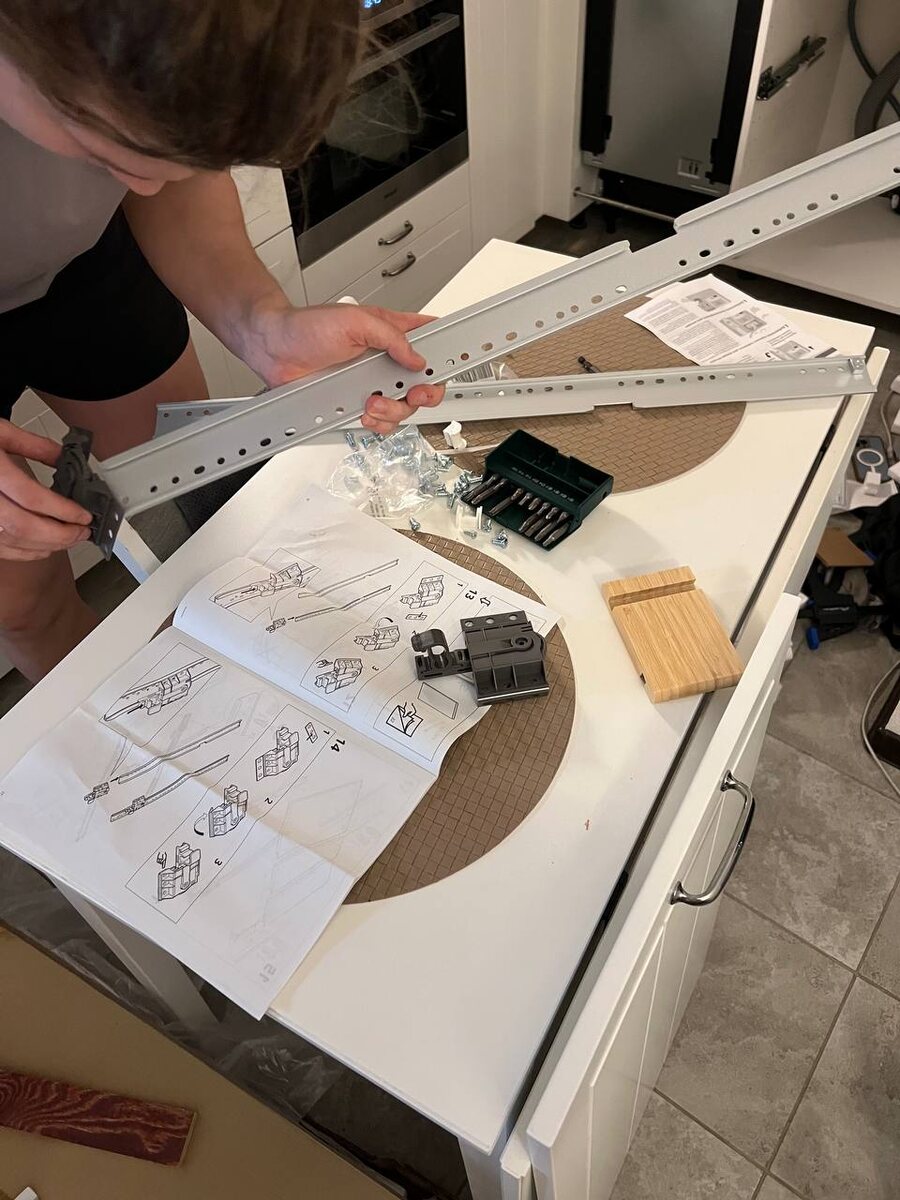 ❤️ Оказалось, что у икеи высокий фасад, и они продавали для посудомойки специальные рельсы, которые устанавливаются между машинкой и дверцей… Мы пять лет почти прожили с недоделанной кухней и не знали об этих нюансах, а икеи уже и нет👀 Сперва (до того, как узнали об этом способе) думали вернуть посудомойку: дверца открывалась на градусов 30, вместо 90 — так не годится. Но дело в том, что все посудомойки стандартной высоты, мы поняли, что проблема в нашем фасаде, и Сёма нашел такой способ. Здесь, конечно, все нифига не просто, Сёма пыхтит, но делает