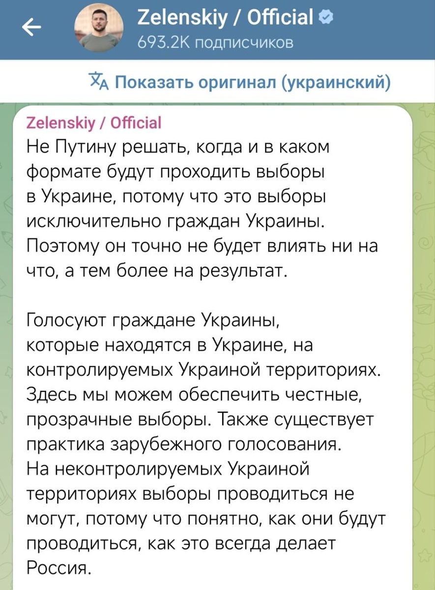 ». Но говоря о «зарубежном голосовании» он сразу отсекает почти 10 млн украинцев, живущих в России и Беларуси, бежавших от самого Зе. Мог бы провести выборы в своём кабинете, чего уж. На мнение народа ему насрать. 😶 @pridybaylo