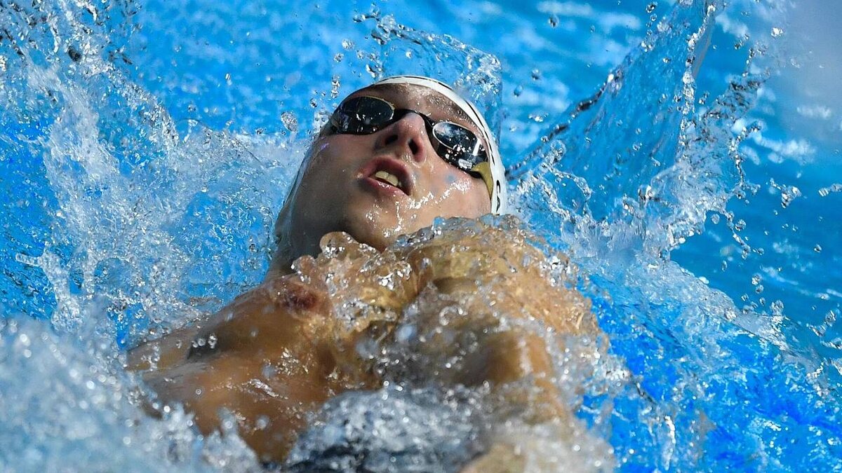 Павел Самусенко лидирует в финальном заплыве на дистанции 200 метров на спине с результатом 1:49.01