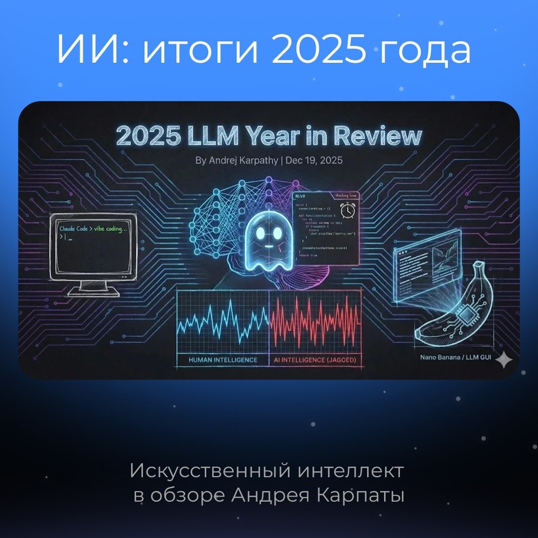 ⭐️ Андрей Карпаты, известный специалист по ИИ, подвел итоги года в мире больших языковых моделей . Его главный вывод: прогресс шел не там, где ждали, и оказался куда интереснее. 😇 Перевели с Claude на Vasilisa.ai некоторые тезисы из его разбора: 🤯 Интеллект ИИ стал «рваным». Мы думали,что ИИ развивается равномерно. На деле он может быть гением в математике, но тут же ошибиться в очевидном вопросе. Каждая его способность — острый, но узкий пик. 💡«Вайб-кодинг» — программирование для всех. Теперь можно просто описать задачу словами и ИИ напишет код. Это не только открывает возможности для новичков, но и позволяет профессионалам быстрее создавать инструменты. 📺 Будущее — визуальный диалог с ИИ. Сейчас мы общаемся с ИИ через текст. Карпаты считает, что это как командная строка в 80-х. Скоро ИИ будет общаться с нами на нашем языке: инфографикой, схемами, интерактивными элементами. В итоге: ИИ в 2025 оказался одновременно умнее и глупее ожидаемого. Поле для новых идей огромно, а реа