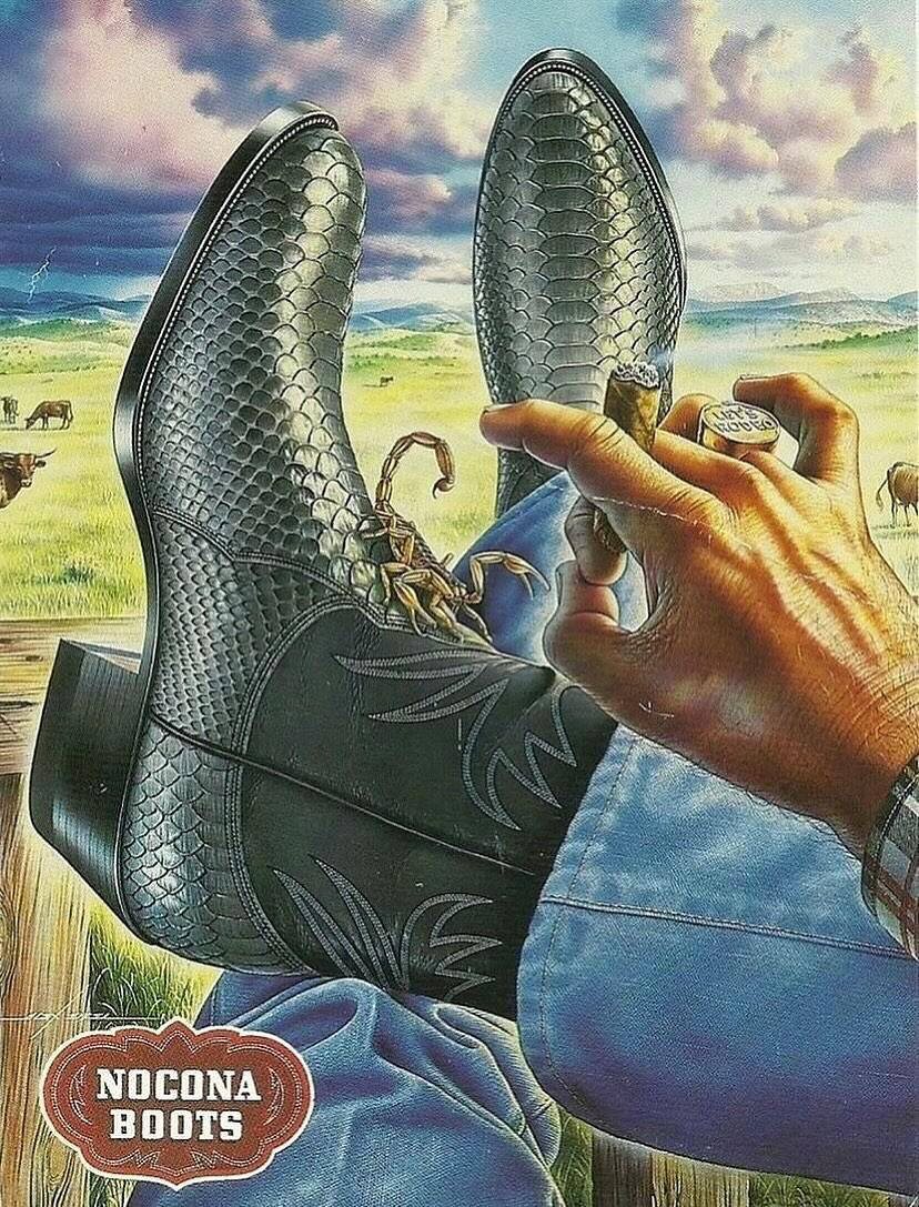 На фоне заполонивших нейроизображений вспомним легендарные постеры Nocona Boots от художника Алекса Эбеля (1979–1984