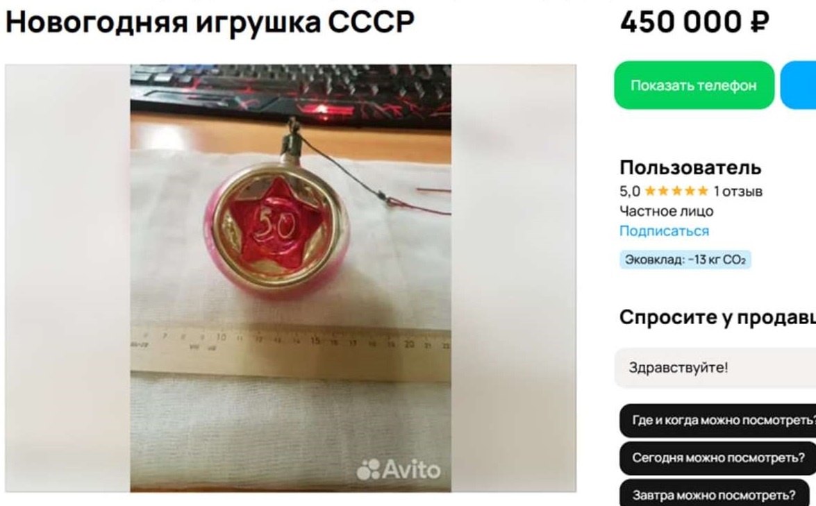 На популярной интернет-площадке появилось объявление о продаже елочной игрушки «50 лет Советской Власти» за 450 тысяч рублей, которая за неделю набрала более 100 просмотров, но пока не нашла покупателя. Продавец предлагает круглую игрушку с изображением звезды и числа «50» в центре, позиционируя ее как уникальный новогодний сувенир. Несмотря на высокий интерес, выраженный в количестве просмотров, желающих приобрести украшение по столь значительной цене до сих пор не нашлось. Подобные объявления о продаже коллекционных предметов советской эпохи периодически появляются на рынке, однако их стоимость редко достигает таких высот. Обычно ценность подобных предметов определяется их редкостью, состоянием и историческим контекстом.