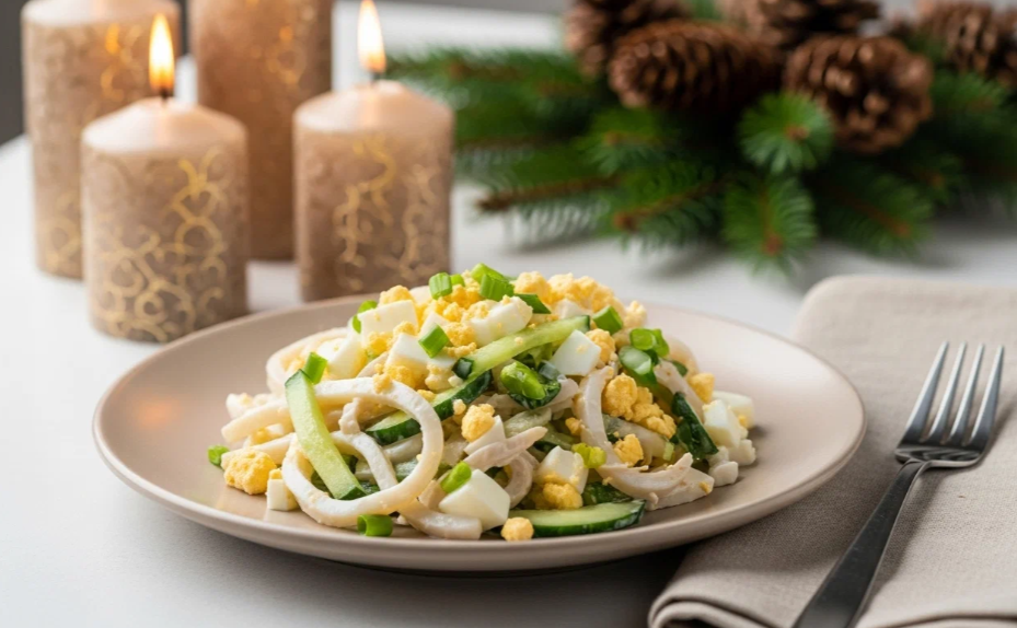 Когда хочется лёгкости, но не пустоты, когда душа просится к морю, а за окном - снежная равнина, этот салат станет вашим спасением. Он - как стремительный, солёный ветер, запертый в миске: пробуждающий, бодрящий и невероятно нежный. Здесь нет тяжести, только прозрачная глубина океана, отражённая в упругой соломке кальмара и оттенённая сочным хрустом зелени. Ингредиенты для океанической симфонии: Искусство приготовления: танец с секундомером Дайте салату 10 минут настояться под плёнкой в холоде. Подавайте в прозрачной салатнице или порционно, украсив пером зелёного лука. И вот он - Морской бриз. На вилке - упругая, сладковатая полоска кальмара, тут же встречающаяся с прохладным хрустом огурца, нежным яйцом и пикантным сыром. А острый лучок бьёт, как настоящие солёные брызги в лицо. Это гастрономический глоток свежего воздуха, лёгкий, но убедительный, элегантный и запоминающийся аккорд в новогоднем меню. Приятного аппетита и пусть ваш праздник будет наполнен свежестью!