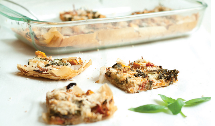 - Оставшиеся 2 листа фило порвите или покрошите руками на кусочки и хаотично разложите сверху — это создаст красивую хрустящую корочку. Посыпьте твёрдым сыром и свежей зеленью (укропом или петрушкой) — аромат будет сумасшедший!