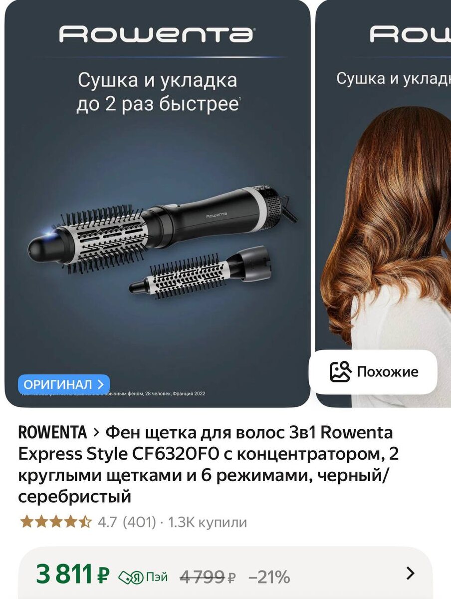 Фен щетка для волос 3в1 Rowenta Express Style CF6320F0 с концентратором, 2 круглыми щетками и 6 режимами, черный/серебристый