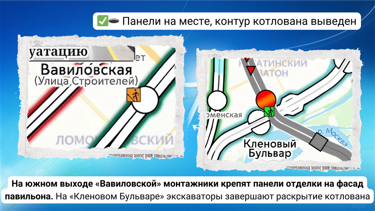 официальные отчеты. Давайте вместе разберемся, что же на самом деле происходит с нашей Москвой. Поехали? В первой части покажем строительство выхода из южного вестибюля 🚇 станции «Вавиловская» 🏡Троицкой линии к дому 74 по Ленинскому проспекту. Начат демонтаж бывшей объездной дороги Ленинского проспекта. Началась подготовка к восстановлению тротуара. У строящегося павильона прокладывают коммуникации, раскрыт котлован у эскалаторного входа. Продолжается монтаж панелей отделки на входном и лифтовом павильонах. Во второй части окинем взором площадку станции 🚇