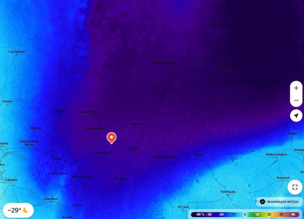 - Вот это ничего себе! - громко подумал я про себя, когда неделю назад посмотрел прогноз погоды на сегодня. Сейчас я пишу публикацию, а термометр уже показывает минус 29 градусов. К четырем утра температура достигнет отметки в минус 35 градусов. Это, получается, самая холодная ночь в 2025 году. А чему удивляться, если на дворе зима? Просто прошлая зима была относительно тёплой. Сегодня погоду можно смотреть в режиме онлайн. Причем можно рассмотреть в прогрессе все движения воздушных масс. Уже не нужно в определенной время включать телевизор, чтобы приятная девушка рукой махнула на наш край и назвала бы заветные цифры температуры. И вот так "страшненько" выглядят холодные массы: Как видно, мы попали самым краем. Но еще страшнее смотреть в больших масштабах: Иногда в голову приходят мысли: - А что бы делали, например, в Европе, если бы однажды это всё сформировалось на их территории? Там точно не готовы к подобным температурам. А у нас - дело вполне привычное. Мы ставим более спец