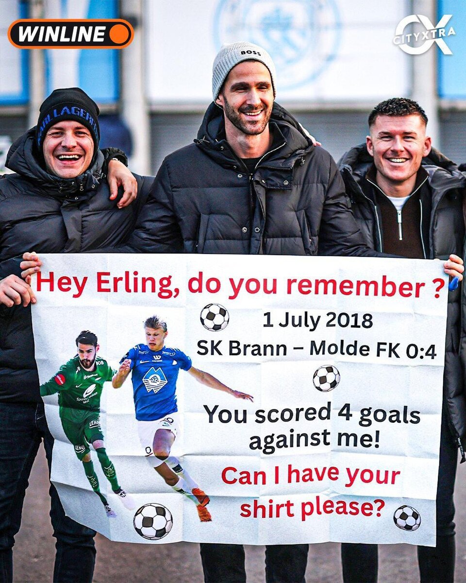 Это бывший вратарь норвежского Бранна Самуэль Радлингер. Он взял с собой плакат, на котором написал, что в 17-летнем возрасте норвежский форвард сделал покер в ворота Самуэля 😂 А теперь Самуэль хочет попросить у Холанда футболку. Кстати, двушку сегодня Холанд уже забил.