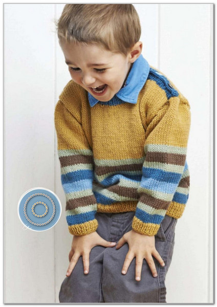 Вам потребуется: пряжа King Cole Merino Blend DK (100% шерсть, 50 г/112 м) - 100 (100: 100: 150: 200: 200) г горчичного цвета (пряжа A, 855); по 50 (50: 50: 50: 100: 100) г пряжи - синего цвета (пряжа B, 1985), цвета шалфея (пряжа C, 853), коричневого цвета (пряжа D, 3089) и голубого цвета (пряжа E, 18); спицы 3,5 мм и 4 мм, 3 пуговицы.