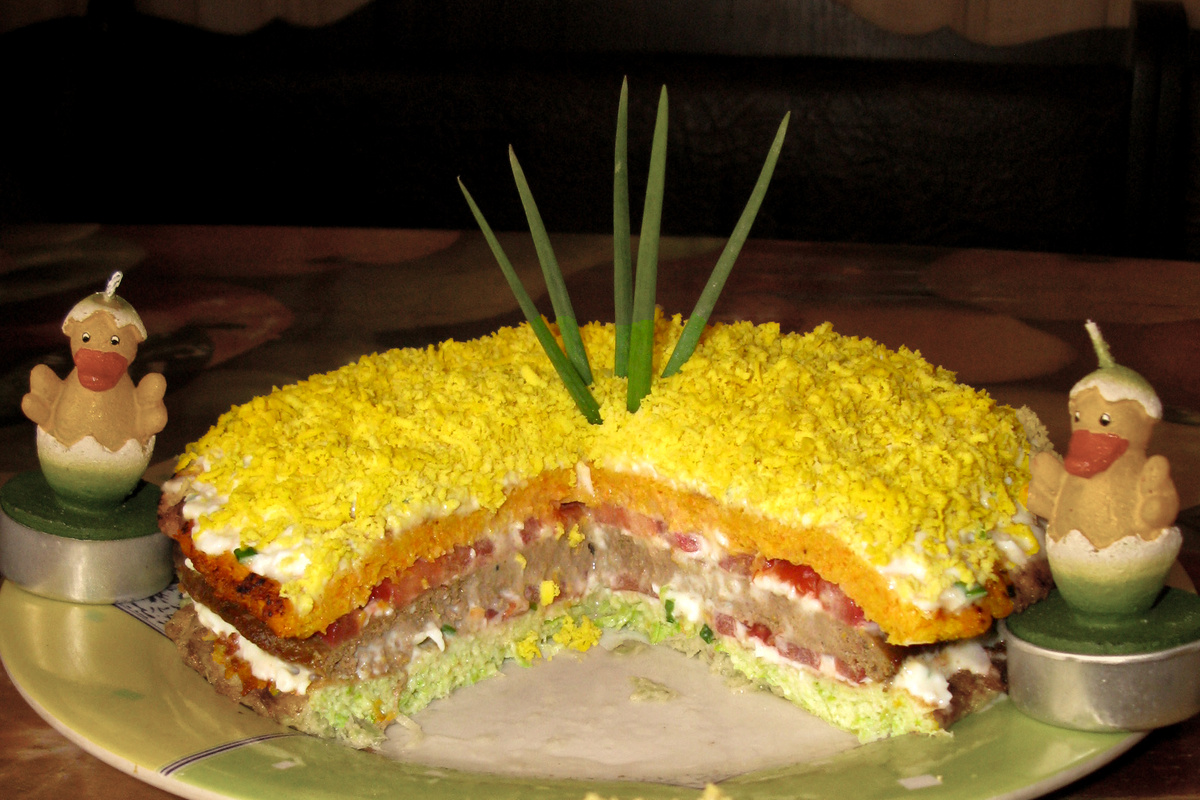 1. Печеночный торт с овощной прослойкой
