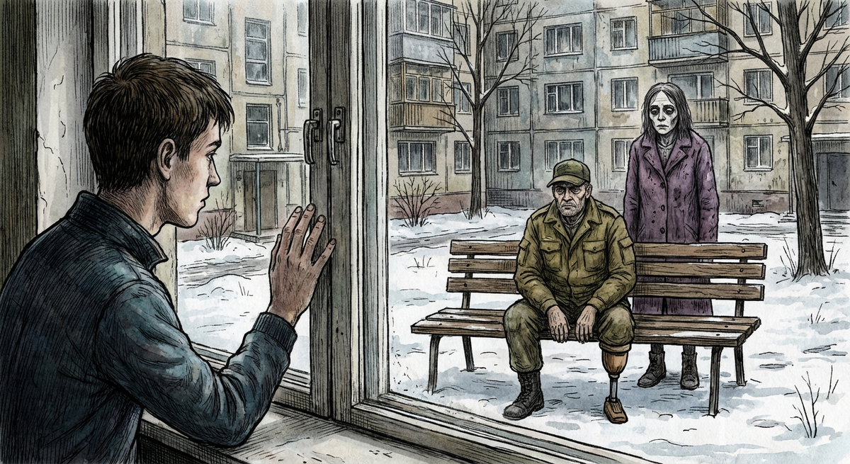 Снимал я однушку в спальном районе. Типичное геттоподобное место: алкашня вечно толкающаяся на детской площадке, тучные тётки на лавках у подъезда и любители парковать машины на газонах. Окна мои выходили прямо во двор. Я тогда временно без работы кантовался, часто залипал у окна, наблюдал за жизнью двора. И почти сразу заметил одну странную пару. Каждый день, ровно в три часа дня, на лавочку у третьего подъезда садился мужик. В старой армейской куртке, кепка на глаза надвинута. И самое приметное — одна штанина подвернута и протез у него вместо левой ноги. Дешевый такой, деревяшка с резинками. А за спиной у него, чуть поодаль, всегда стояла женщина. В каком-то нелепом фиолетовом пальто, хотя на улице еще достаточно тепло было. Лица её я разглядеть не мог — она всегда голову опускала. Стояла столбом и не шевелилась. Мужик сидел час, курил, смотрел на голубей. Потом вставал, ковылял к подъезду, и женщина шла за ним, шаг в шаг, как привязанная. Мне стало жалко мужика. Инвалид, видно, что