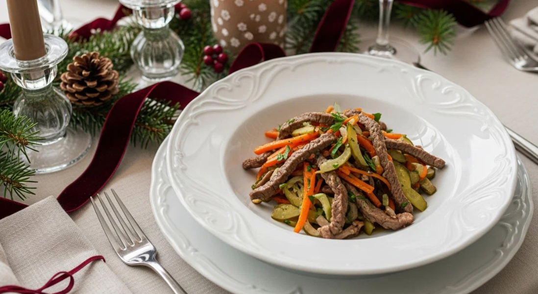 Его имя - вызов всем утончённым яствам. Это не салат, а праздник плоти, хруста и дыма, воплощение щедрого, почти богатырского аппетита. Здесь нет места легковесности - здесь царят согревающая сытость говядины, сладкий жар моркови, золото лука и дерзкая кислинка солёного огурца. Это блюдо для тех, кто ценит честный, ясный и невероятно ароматный вкус. Ингредиенты для щедрого пира: Действо на кухне: рождение аромата Подавайте «Обжорку» слегка тёплым или комнатной температуры, чтобы чувствовалось всё богатство оттенков. Он прекрасен сам по себе и бесконечно хорош с отварной картошкой или грубым ржаным хлебом. Это - гимн простой и ясной радости. Вилка находит и нежную говядину, и сладкую морковь, и хрустящий огурец, а каждый кусочек окутан дымным шлейфом жареного лука и соево-уксусной остротой. Это пиршество для души и тела, тёплое, хлебосольное, бесконечно уютное и по-настоящему праздничное в своей щедрой простоте. Приятного аппетита и хорошего застолья!