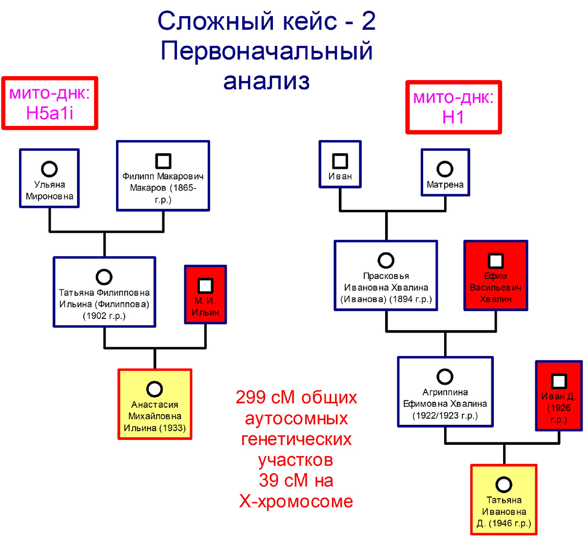 Продолжаем разбирать сложный кейс. Часть 2 (часть 1 здесь) После расспросов куратора ДНК-результатов Татьяны Д. удалось выяснить, что она родилась в 1946 году в поселке Вырица Ленинградской области. Ее мама, Агриппина, родилась в деревне Дудино Бежаницкого района Псковской области, а папа – с Украины. Деревня Дудино находится по соседству с деревней Дубки, где родилась мама Анастасии, Татьяна Филипповна. Поэтому было понятно, что общее родство с Татьяной Д. у нее идет по линии ее мамы, а у Анастасии по линии ее мамы соответственно. Более того, благодаря тому, что куратором ДНК-результатов Татьяны Д. помимо нее самой были протестированы ее родственники по линии ее дедушки, Ефима Хвалина, которые не показали родства с Анастасией, удалось вычислить, что оно идет по линии ее бабушки, Прасковьи. Также анализ времени рождения членов семьи Филипповых/Макаровых и Хвалиных указал, что Анастасия и мама Татьяны Д., Агриппина, скорее всего, были троюродными сестрами. В ходе проведенных генетическ