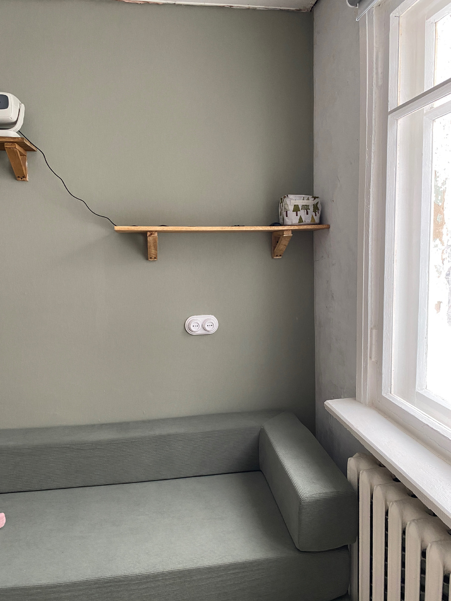 Ещё в самом процессе, но результат уже радует. Очень приятно находиться в комнате с зелеными обоями - они отлично гармонирует с деревянными полками.