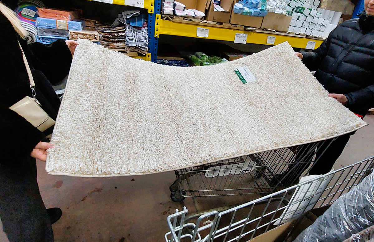 Какой цвет коврика лучше взять, светлый или темный, в Светофоре обсуждала молодая пара при выборе. Ковер "Шегги", по другому - "лохматый". Размер 0,8*1,5 м по цене 1215,6 рублей. Беларусь Есть еще такие ковры темного цвета шоколада. Но молодая пара выбрали светлый. И правильно, на нем меньше заметен мелкий мусор Коврик уже в тележке Светофора и можно дальше выбирать покупки. В продаже турецкие Мандарины по 116,2 рублей за кг. Томаты по 99 руб/кг. Пекинская капуста остатки несколько кочанов, по цене 92,8 рублей. Обратила внимание на Акцию в текстильном отделе. По ней Футболка, 100% хлопок, пошита в Узбекистане, размеры разные. Акция "2+1", цена 168,5 рублей. Акция «2+1» (или «2 по цене 1») может означать, что при покупке двух товаров один из них предоставляется в качестве подарка. Кружка керамическая, 380 мл по цене 104 руб. Кружка покрыта блестящей глазурью приятных расцветок. По краю каемочка коричневого оттенка. Удобная большая ручка. Теплые носки мужские, женские из 100% шерсти,