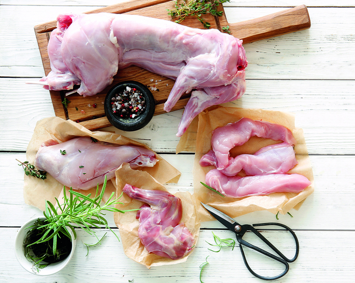 Мясо кролика считается одним из самых диетических и легкоусвояемых. Но это совершенно не значит, что в кролике вообще нет жира. Есть, и очень вкусный! Он просто довольно легко отделяется от мяса, и вы сами можете решать, хотите ли вы его использовать. Но если вы запекаете кролика, от жира лучше не избавляться — потихоньку тая, он сделает мясо ещё более вкусным. Факт В 100 г мяса кролика 156 ккал и всего 8 г жира. Мясо кролика не обладает ярко выраженным вкусом, а значит, легко воспринимает ароматные добавки. Классические «компаньоны» кролика в европейской кухне — свежие тимьян и розмарин, чеснок, лук-шалот, бекон (часто копчёный), оливки или маслины, молотая сладкая паприка, белое сухое вино и, конечно же, нерафинированное оливковое масло. С азиатскими ингредиентами (имбирь, чили, соевый соус, карри) он тоже прекрасно сочетается. большие и маленькие хитрости Причём в кислом растворе (вода с уксусом, лимоном или белым вином) — без этого, дескать, мясо имеет неприятный запах. У современн