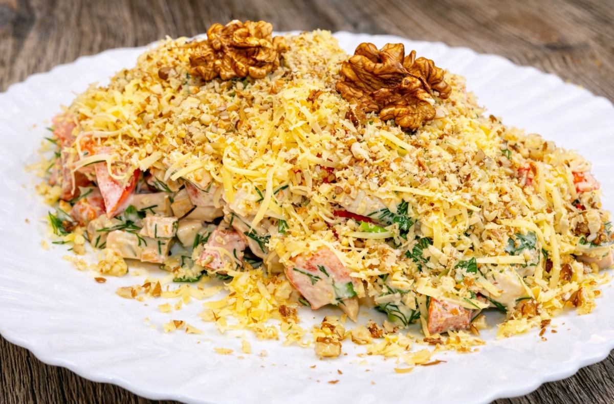 Иногда самые удачные рецепты приходят не из кулинарных книг, а из разговоров. Однажды мне довелось пообщаться с шеф-поваром ресторана высокого уровня, и на вопрос о самом популярном салате в их меню он без раздумий назвал именно этот. Никаких сложных техник, но идеальное сочетание вкусов и текстур. Я приготовила его дома — и теперь понимаю, почему гости в ресторане заказывают его снова и снова. • Куриное филе (отварное или запечённое) — 300 г • Болгарский перец — 1 крупный • Твёрдый сыр — 120–150 г • Грецкие орехи — 70–80 г • Свежий укроп — небольшой пучок • Майонез — 2–3 ст. л. • Сметана — 1–2 ст. л. • Соль и чёрный перец — по вкусу 1. Курицу нарежьте небольшими кубиками или разберите на волокна. 2. Болгарский перец очистите от семян и нарежьте тонкой соломкой. 3. Укроп мелко порубите. 4. Сыр натрите на крупной тёрке. 5. Грецкие орехи слегка подсушите на сухой сковороде и мелко порубите. В глубокой миске соедините курицу, перец, укроп и половину орехов. Заправьте смесью майонеза и