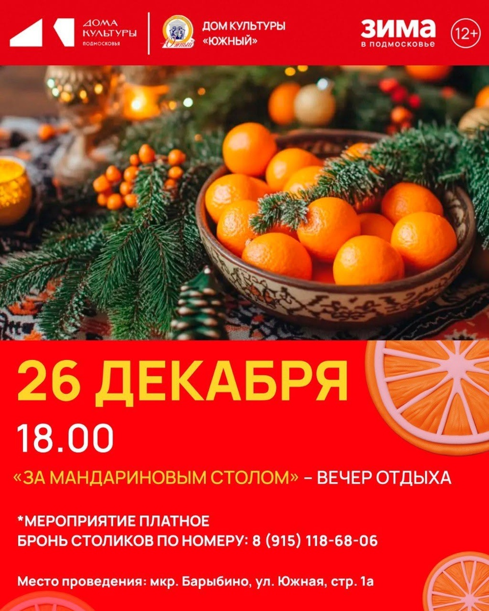 ✨ Приглашаем вечно занятых взрослых на вечеринку, посвященную встрече Нового года! ❄️ Что будет? Много музыки, игр и ярких эмоций! Конечно, будет встреча с главным волшебником зимы. От нас: места за столами, посуда и вкусные мандарины! А еще игры, конкурсы, дискотека, розыгрыш суперприза🎁 От вас😉: отправьте нам на номер 8(915)118-68-06 (в телеграм) свое детское фото. Найдите время, чтобы почувствовать праздник сердцем, как дети. Вам нужна пауза - 4 часа для себя! Поймайте атмосферу волшебства и бегите дальше! 🚫 Возраст: 12+ 📆 26.12.2025🕒18:00 🏢 Городской дом культуры «Южный» 📍 г.о.Домодедово, мкрн.Барыбино, ул.Южная, стр1А ✅ Мероприятия Домодедово https://dzen.ru/id/66f10385cc4c5a16f7b5fb02 http://vk.com/domodedovo_events http://dzen.ru/domodedovo_events