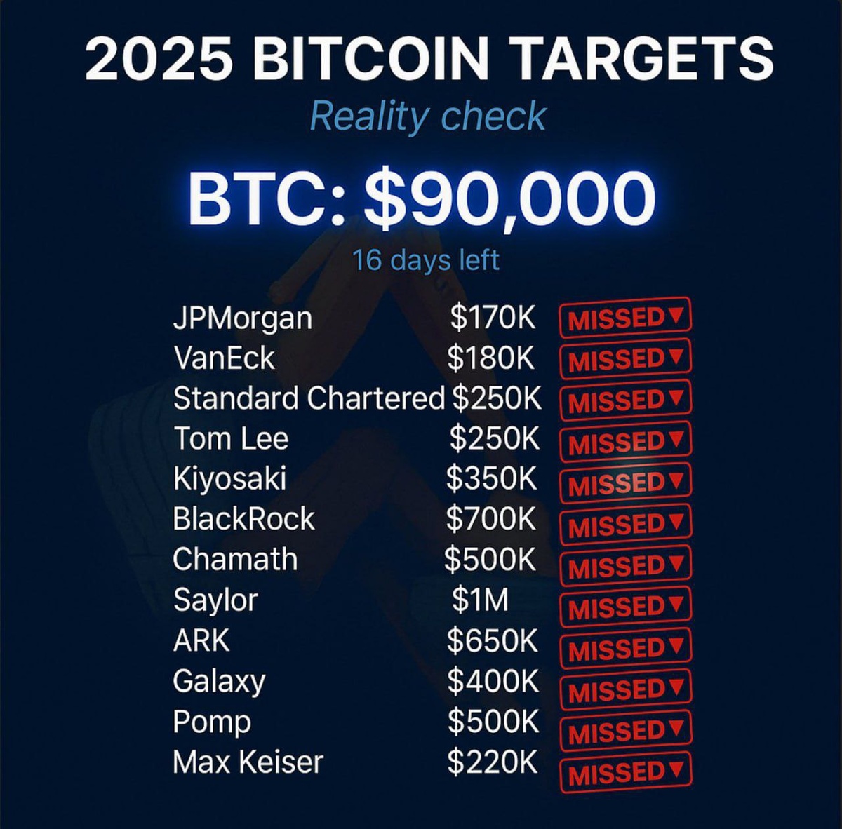 ? BTC is chilling at around $90K with just 16 days left in 2025. 😲 Turns out, every expert forecast hit the snooze button! ➡️ JPMorgan & VanEck: $170K-$180K ➡️ Standard Chartered & Tom Lee: $250K ➡️ Kiyosaki & Chamath: $350K-$500K ➡️ ARK & BlackRock: $650K-$700K ➡️ The loudest maxis: $1M! Spoiler alert: None of these predictions even came close! 😂 Just a little reminder from the market folks—price targets are more like stories than guarantees. 📖💰 In the end, reality has its own rules: price, time, and liquidity. Let’s keep it real! 🕶️✨ #Bitcoin #CryptoReality