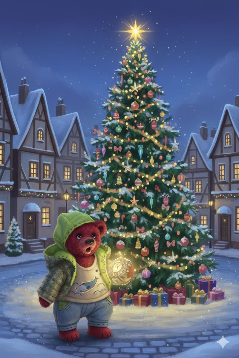 Мио шёл, напевая новогоднюю песенку. Вдруг он остановился на площади. Его внимание привлекла огромная новогодняя ёлка! На её верхушке что-то светилось, это был хрустальный северный олень, сияющий мягким голубым светом.