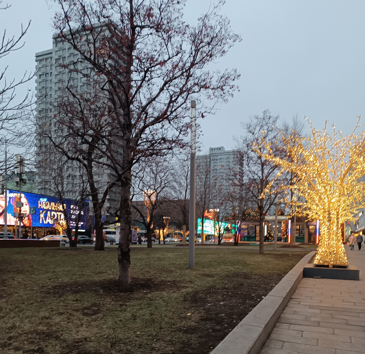 21 декабря 2025 года Здравствуйте, друзья! Улица Новый Арбат называлась во времена моей юности проспект Калинина и строилась буквально на моих глазах. Мне она никогда не казалась ни красивой, ни уродливой, отношение было чисто утилитарным. Проспект с широкими тротуарами и большим количеством магазинов, в которых велик шанс найти очередь и купить что-нибудь очень нужное. Или не очень нужное, а то что "давали", то и брали. Причём в отличие от исторических магазинов вроде ГУМа, очередь располагалась там довольно просторно. Торговые залы были большими, а дефицитные товары далеко не во всех отделах. Но в этот раз пришла я на Новый Арбат не за товарами, а за воспоминаниями. Давно мы с ним не виделись. Хотелось посмотреть, что там нового, а может и что-то старое осталось. На первый взгляд, Новый Арбат показался мне каким-то "уставшим" или даже "устаревшим". И дома эти не такие уж высокие, а внешне скорее мрачные. Но не будем о грустном. Итак, улица Новый Арбат, от Смоленской до Арбатской площ