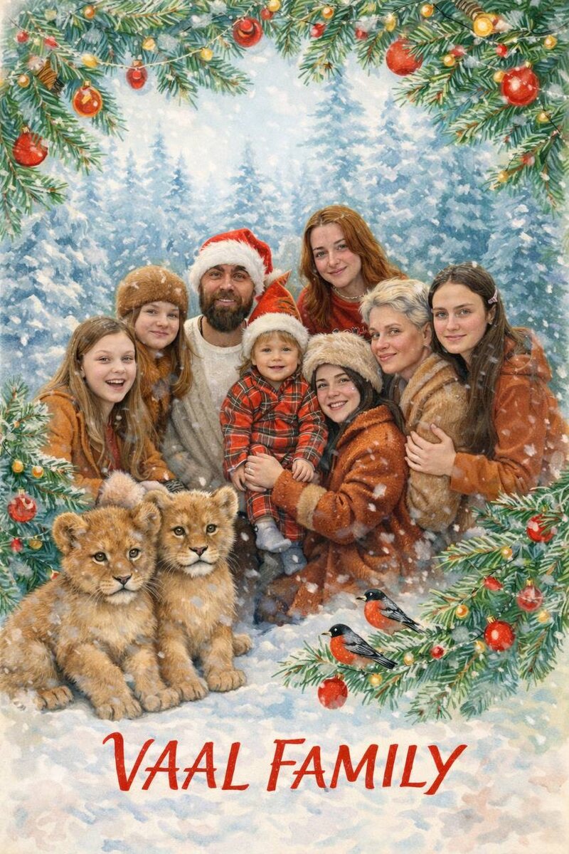 Не меняя внешность людей на фото, создай с ними советскую новогоднюю открытку 60-70-х. Зимняя уютная иллюстрация: люди в зимней одежде, характерной той эпохе. Открытка обрамлена еловыми ветками, украшенными гирляндами и шарами, на фоне снежного леса. Так же в кадре — милые львы с детализированным пушистым мехом и маленькие - снегири. Использовать нежную живописную технику (акварель) с мягкими растушевками, пастельными приглушёнными цветами: холодный снежный фон и тёплые коричнево-рыжие оттенки животных, яркие красные и золотые акценты на украшениях. Атмосфера — волшебная и спокойная, с падающим снегом. Внизу красная рукописная праздничная надпись кистью «С НОВЫМ ГОДОМ»