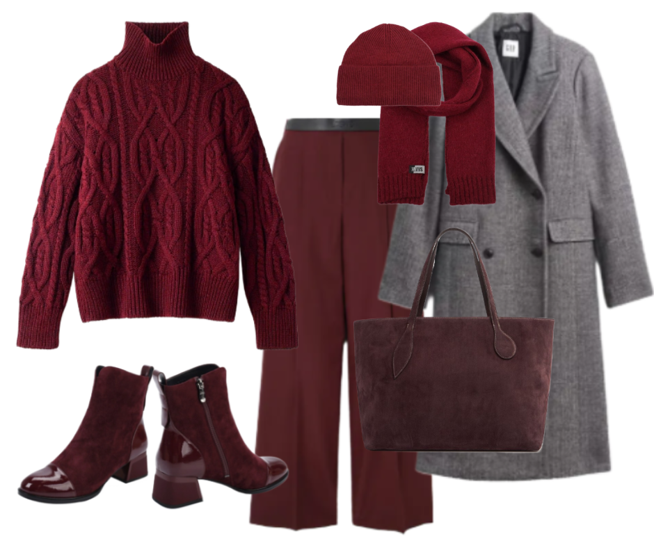 Начнем с роскошного бордового оттенка, который идеально подходит для зимнего сезона. Бордовые брюки, бордовый фактурный джемпер и бордовые ботильоны создают монохромный эффект и глубину. Серое пальто - стильное завершение наряда, которое добавляет ему уюта и элегантности. Детали: бордовые шапка, перчатки, коричневая замшевая сумка-тоут. Серые брюки – универсальная база для множества зимних комплектов. Кофта лазурного цвета добавляет яркий акцент, разбавляя монохромность серого. Серый пуховик с поясом не только согреет, но и выгодно подчеркнет талию. Светло-серые ботильоны-чулки создадут эффект е