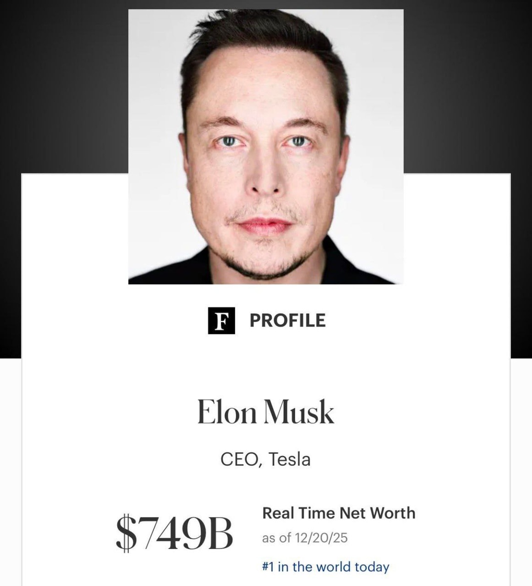 💰 Маск взлетел до небес: $749 млрд и титул самого богатого человека