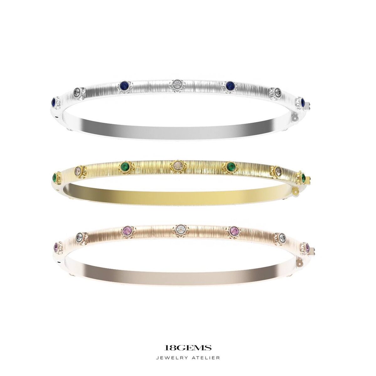 Браслет из розового золота посвящён дочери, с розовыми сапфирами как мягким акцентом на чувственность. Браслет из белого золота посвящён сыну, с инкрустацией природными сапфирами в насыщенном цвете. А браслет из жёлтого золота объединяет родителей: изумруды и