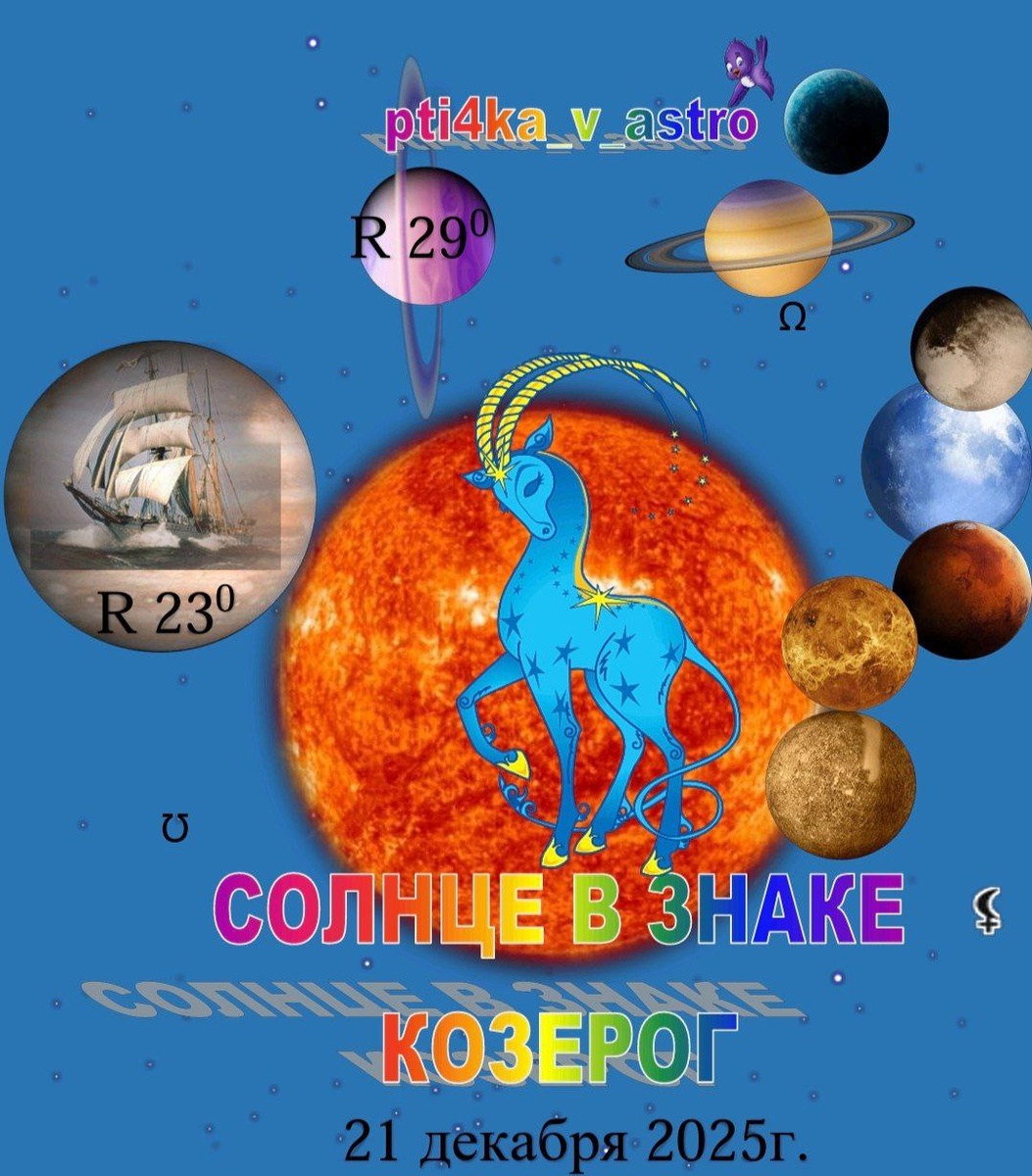 ❄️ ☀️ Солнце входит в холодный, сдерданный знак Козерог ♑️ 💫 Именно с заходом Солнца в Козерог наступает астрономическая Зима ❄️ Усиливаются холода, морозы крепчают Именно сегодня самая длинная ночь в году 🤓 И, я хочу с вами поделиться мудрым советом, который получила сама от себя! https://dzen.ru/media/id/5f31062d54d22d2496477f45/-22122023g-v-0627-msk-solnce-perehodit-v-zimnii-i-holodnyi-znak-65843a7120643e4bfa0bc619 Здесь в комментариях делитесь выполненной практикой и инсайтами 😉 Вчера 20.12 было Новолуние, а сегодня наступает один из сильнейших дней Зимы Мечтайте и идите смело к своей мечте😉 Предлагаю расклад "Зима" - за 808 руб. Вопросы к раскладу: https://dzen.ru/media/id/5f31062d54d22d2496477f45/-rasklad-taro-6928136c0ea32c24c372e195 Актуально до 30.12.2025г.