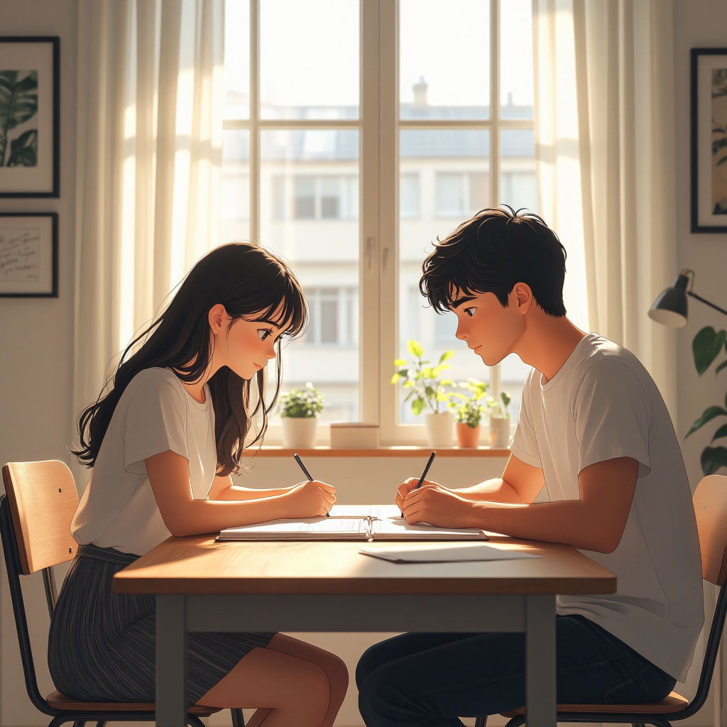 Они вместе просматривают оставшиеся темы, отмечают те, что требуют повторного повторения. Соня делает краткие заметки в своём блокноте, Артём переписывает ключевые формулы в карманный справочник.