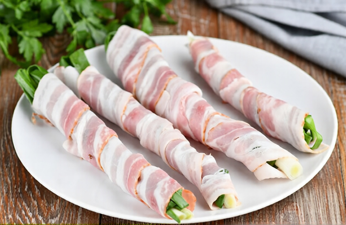 Недавно я открыла для себя это сочетание, и оно меня просто поразило! Берем примерно 150 грамм сырокопченого бекона. Он придает блюду соленый вкус и приятный аромат копчения. А еще 100 грамм зеленого лука. Его нужно промыть и хорошо просушить. Размер лука может быть любой, не страшно.