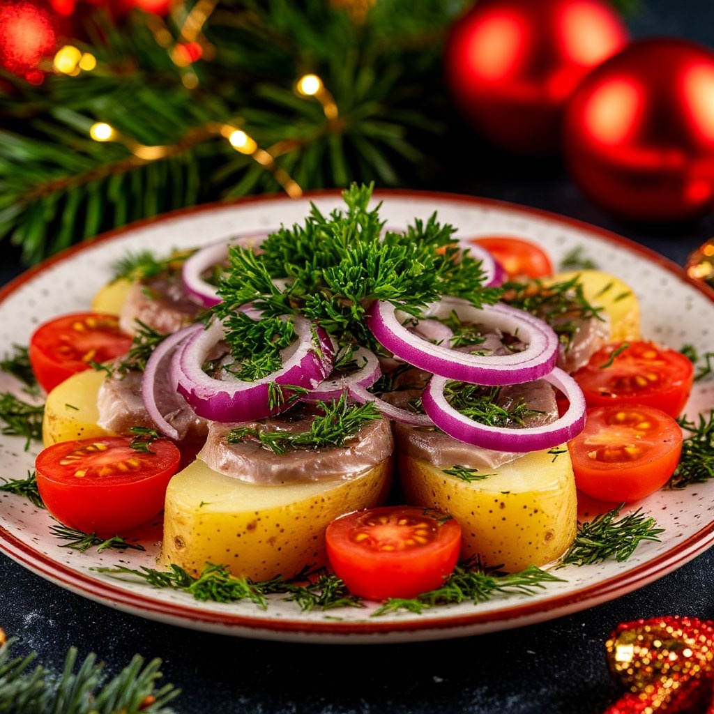 Погрузитесь в мир освежающих вкусов и идеальных текстур! Мягкий, бархатистый отварной картофель, охлажденный до совершенства, становится идеальной основой для этого блюда. Его нежность контрастирует с упругой, насыщенной сельдью, которая дарит яркий морской акцент. Сочные, сладкие ломтики помидоров взрываются свежестью, а тонкие колечки репчатого лука добавляют пикантную нотку, делая каждый кусочек незабываемым кулинарным приключением. Прекрасный выбор для тех, кто ценит простые, но изысканные вкусы.