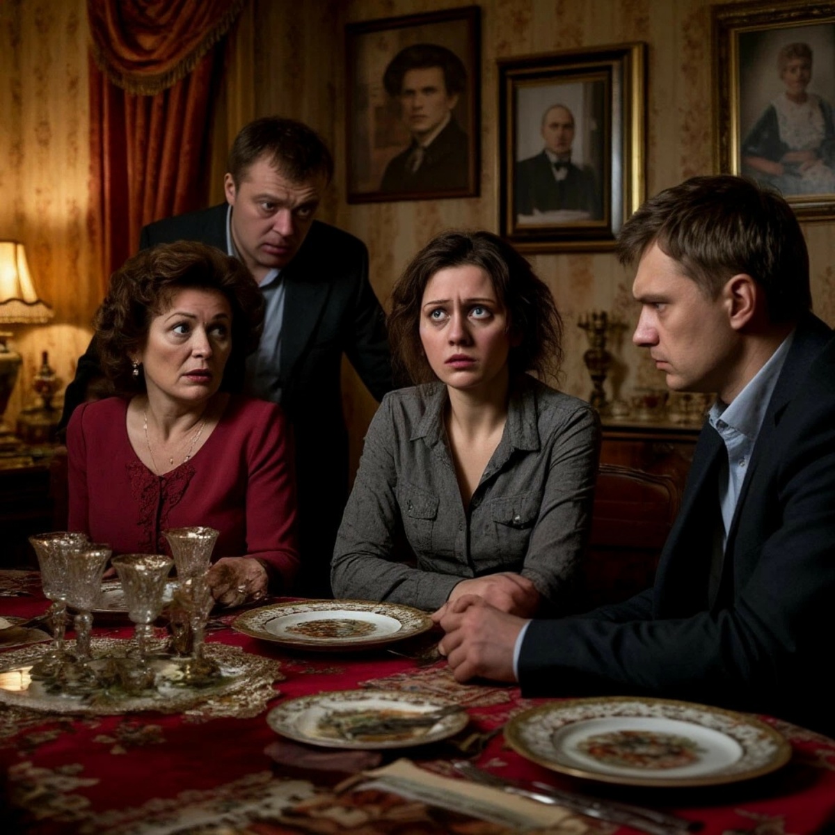 Она обернулась. Её взгляд скользнул по знакомым лицам, искажённым гримасами ожидания новой ссоры. По Сергею, её мужу, который нервно теребил край скатерти, приготовившись, как всегда, бросаться между фронтами с белыми флагами глупых компромиссов. По Антону, его брату, с налитыми самодовольством глазами, уже начавшему язвительную ухмылку. По Лидии Петровне, свекрови, чьи руки, только что вытиравшие ту самую драгоценную фарфоровую салатницу с ромашками по краю, замерли в воздухе.