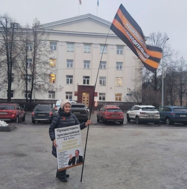 Пикет у Законодательного Собрания Республики Карелия 18.12.2025 года "Предоставить чрезвычайные полномочия Путину". Пикетчик: Клавдия Анатольевна Гурецкая. Роман Мосин: раздача газет, общение с людьми. ПолномочияПутину.рф