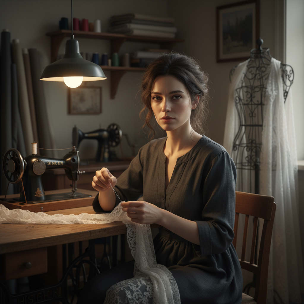 Она берёт свадебное платье французского кружева и смотрит на него долго. Потом она начинает шить, но не так, как раньше. Каждый стежок теперь—это молитва за человека, который уходит в неизвестность. Каждый стежок—это надежда на то, что он вернётся.