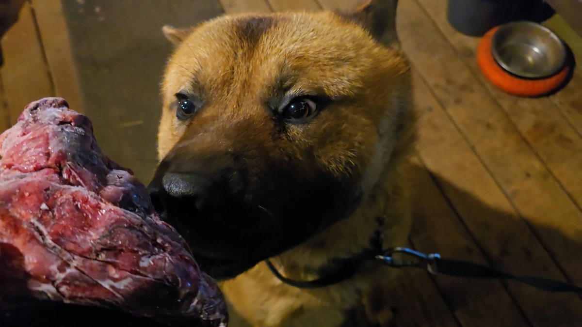 Пёс Кубик доел все свои запасы рыбов. В поисках остаточков я наткнулась на забытый кусок коровьих мяс, специальных длясобаченькиных. Вот Кубик обрадовался!