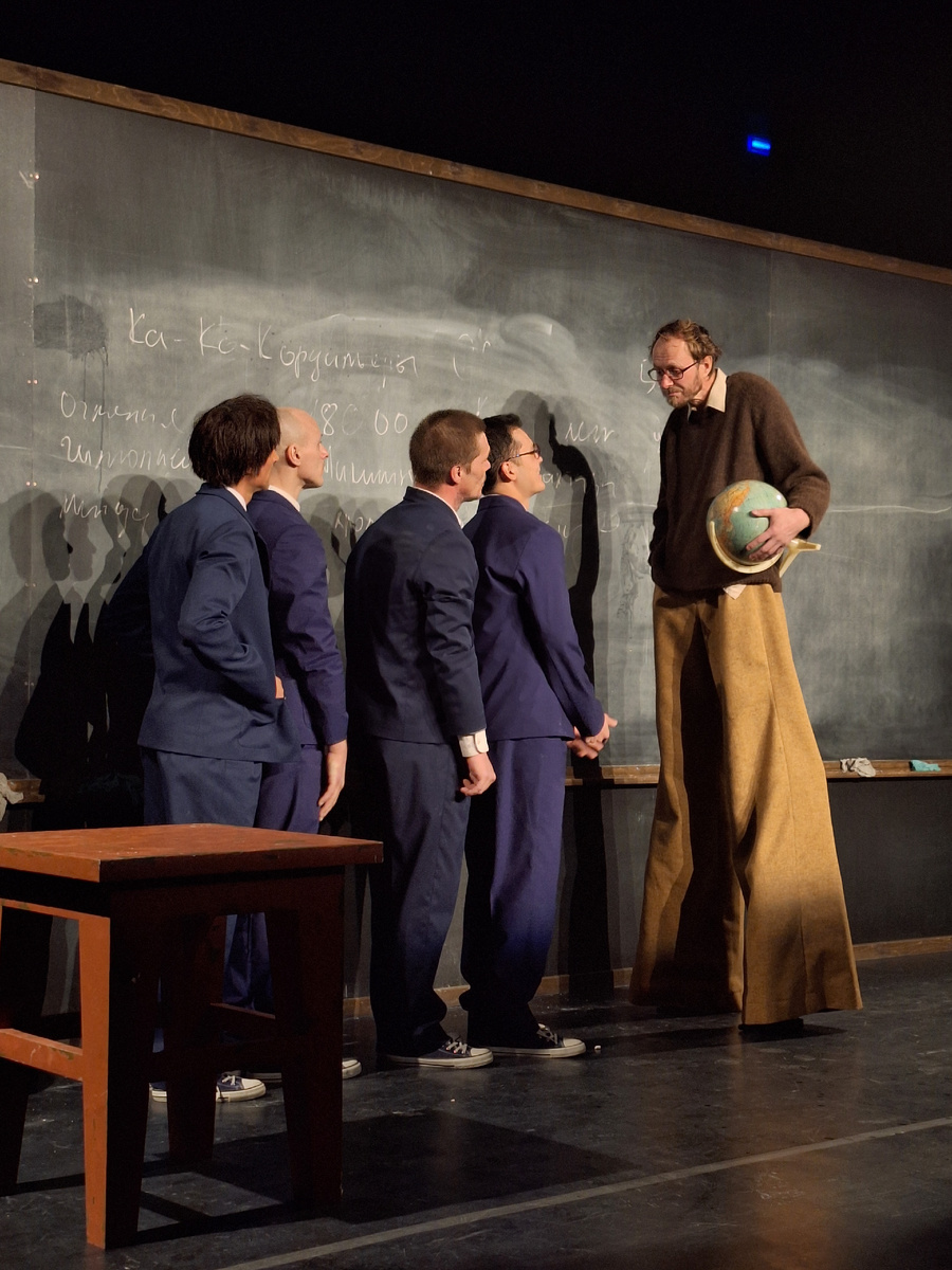 В главной роли Ученика такого-то Артем Быстров, которого очень трудно назвать юным, но режиссёр спектакля считает, что героем произведения Соколова может быть любой человек, возраст там не обозначен, а слабости могут быть у каждого. Главный герой страдает от раздвоения личности и нелинейного восприятия времени. Интересно, что с этой книгой Денис Азаров знаком давно и время от времени перечитывал ее, а сейчас он считает, что пришло время, чтобы поставить повесть на театральной сцене. На мой взгляд, у Артема получилось передать хрупкость именно этого человека и его внутреннего мира. Его влюбленность в учительницу, близкие взаимоотношения с матерью, общение с одноклассниками и их игру в тряпкобол. В этой истории отец этого мальчика находится за скобками, его не играет актер, а он появляется на сцене в виде накрахмаленной пижамы с газетой, которую по сцене перемещает мама. Видимо, отец не смог принять и понять своего сына, согласиться с тем, что он не такой, как все. Кажется, отец живёт в своем мире, где он всеми руководит, а все его слушаются. Не очень понимаю как справился Артем с эмоциональной и физической нагрузкой. Мне кажется, что такие роли необходимо пропускать через себя, через свое сердце, а иначе никак... Нет, ему не пришлось поднимать гири или бегать кросс, зато часть спектакля он находился в двух свитерах, пальто и толстом зипуне. И в таком наряде надо было играть, двигаться по сцене. Сошло не сто потов, а миллион, наверное.