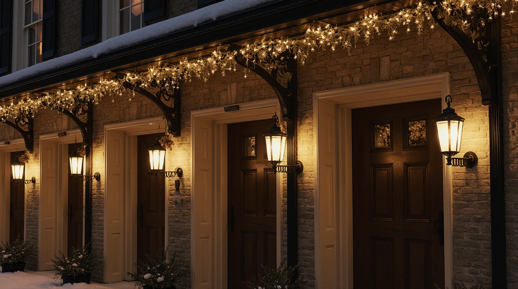 Когда же есть одна-две сильные точки, вокруг которых всё остальное спокойнее, двор начинает выглядеть как продуманная сцена. Фасад в сказочном дворе — это скорее фон и опора, чем место для светового шоу. Хорошо работают: Если на фасаде уже есть архитектурная подсветка, новогодний декор лучше делать деликатно: одна гирлянда по контуру окна, небольшой акцен