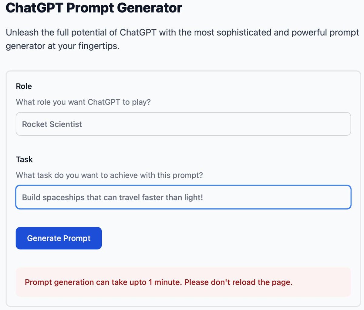 Вы просто выбираете роль ChatGPT (психолог, разработчик, маркетолог) и задачу — а ИИ сам собирает детальный промпт, который выжимает из нейросети максимум пользы. Работает бесплатно, без регистрации, с поддержкой русского языка. Прокачиваем запросы тут. CtrlAltDelights- подписаться