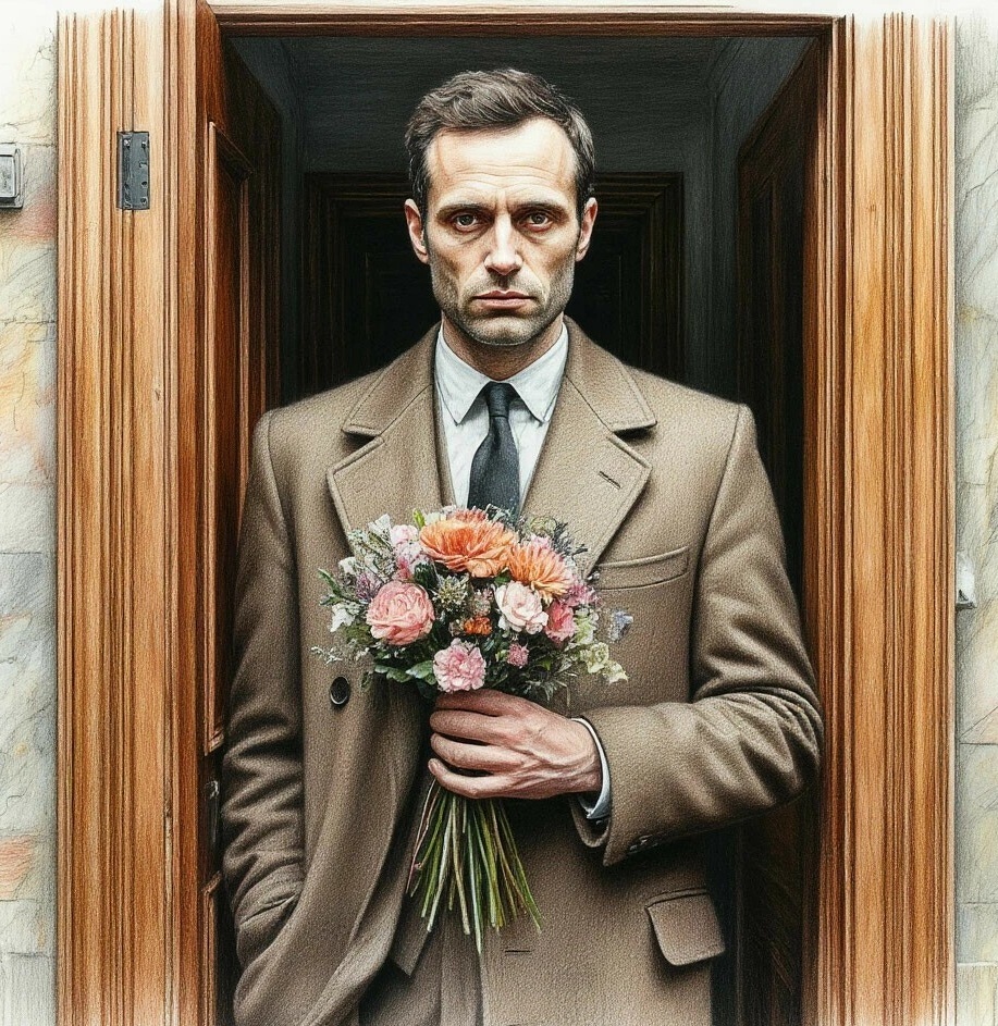 В руках он держал огромный, просто неприлично огромный букет красных роз. Вид у него был слегка помятый: галстук сбит набок, верхняя пуговица пальто расстегнута, а на лице блуждала та самая виновато-обаятельная улыбка, которая раньше заставляла её прощать ему мелкие опоздания.
