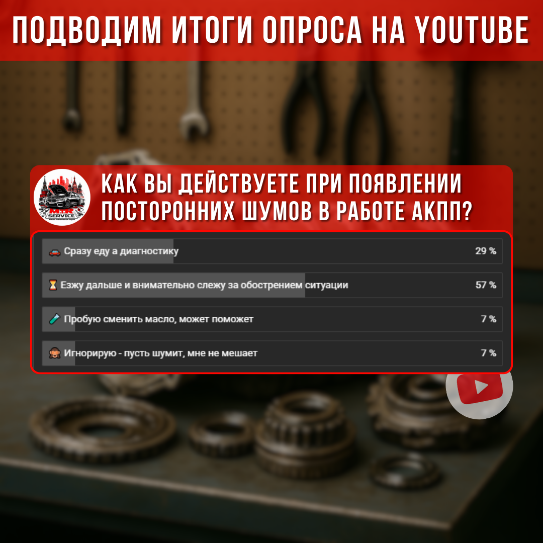 👋🏼 Друзья, на связи MTR Service! По результатам опроса большинство продолжает ездить дальше, просто наблюдая за ситуацией. И только часть автовладельцев сразу едет на диагностику. В практике ремонта АКПП это как раз тот случай, когда ожидание почти всегда играет против коробки передач. 🚗 Любые посторонние шумы в АКПП — гул, вой, скрежет, вибрации — это признак неисправности. Чаще всего причина кроется в износе подшипников, проблемах с насосом, планетарным рядом или нарушении масляного давления. На раннем этапе ремонт АКПП может быть локальным и относительно недорогим. ⏳ Если шумы игнорировать и продолжать эксплуатацию, износ элементов АКПП ускоряется в разы. Незначительная неисправность быстро превращается в серьёзное повреждение, а ремонт автоматической коробки передач становится сложнее и дороже. Мы регулярно сталкиваемся с ситуациями, когда АКПП можно было отремонтировать раньше и с меньшими затратами. 🧪 Простая замена масла в АКПП «на всякий случай» редко решает проблему. Если