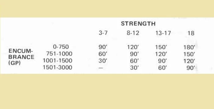 Чтобы определить максимальную скорость персонажа при беге «против течения», нужно сопоставить его силу и степень обременённости по приведённой ниже таблице.