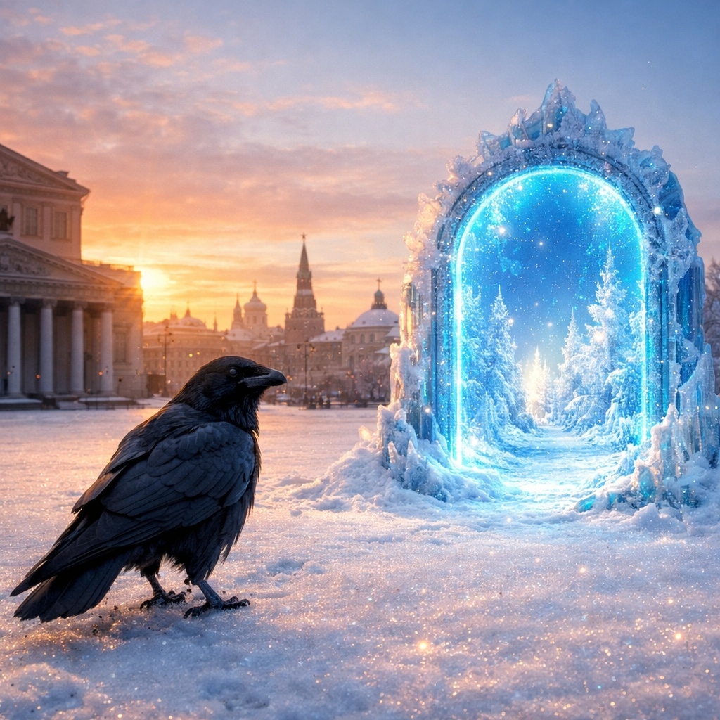 Как только первый луч солнца коснулся снега — воздух задрожал. Снег начал кружиться, поднимаясь в воронку. В центре появился проход, мерцающий голубоватым светом.