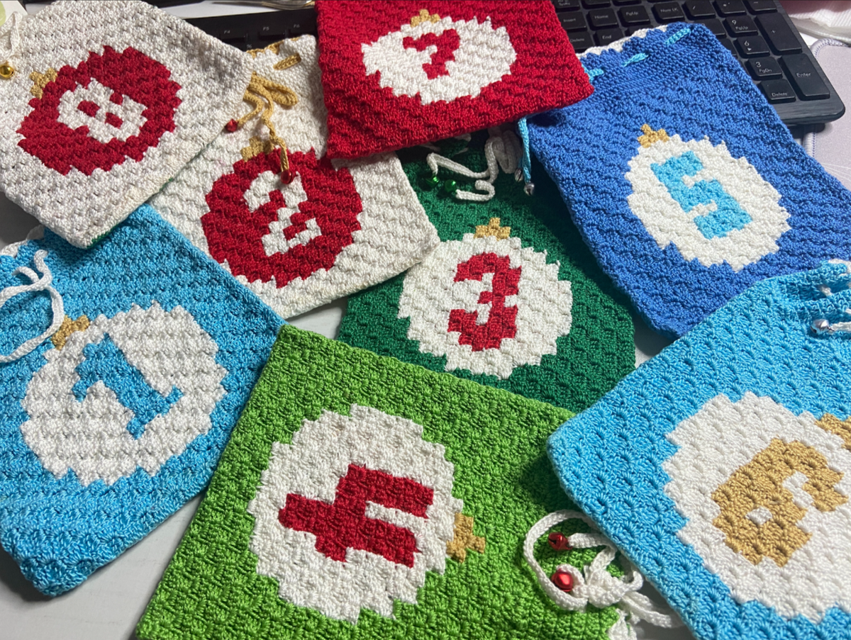 Полная подборка схем для адвент-календаря в виде мешочков, связанных крючком в технике С2С.