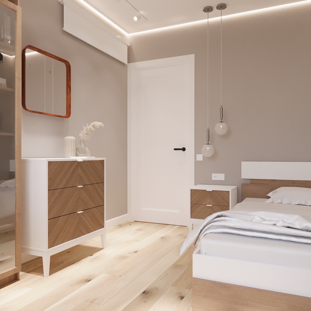 Продолжу публиковать процесс реализации объекта в Царицыно. Комната дочери заказчицы. Изначально задумывалась в спокойной серо-бежевой гамме,с еле уловимым оттенком сирени, но на визуализациях более теплый оттенок, ближе к бежевому. Дочь заказчицы участвовала в процессе выбора цвета стен и мебели в свою комнату. Для визуализации был выбран нейтральный вариант мебели. В процессе комплектации я искала интересную модель, мягкое изголовье в обрамлении дерева. Тонировка у дерева красивая, темный тон под орех, сам материал-сосна, которую я не очень люблю в изделиях , поскольку дерево это мягкое, в процессе эксплуатации достаточно быстро выходит из строя. Но на этом варианте было решено остановиться, поскольку получался нужный баланс между стилем кантри и современными тенденциями. Дочь заказчицы утвердила этот вариант. Также мы подобрали туалетный столик и тумбу прикроватную у того же производителя. Все эти предметы от компании «Райтон». А вот шкаф было решено заказать у тех же мастеров, что