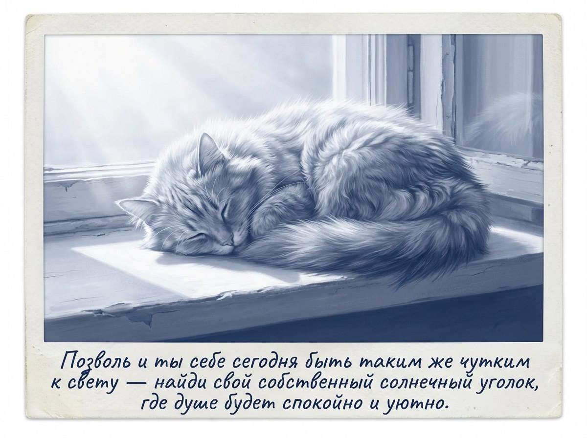 Сегодня особенный рассвет, ведь наступил день зимнего солнцестояния — самая длинная ночь осталась позади, и теперь мир медленно, но верно поворачивается к свету. Почувствуй, как вместе с этим робким солнцем пробуждается и твоя внутренняя надежда. Твой внутренний котик уже давно это знает: он инстинктивно ищет самый первый, самый нежный луч, чтобы свернуться в нём клубочком и впитать всё его тепло. Позволь и ты себе сегодня быть таким же чутким к свету — найди свой собственный солнечный уголок, где душе будет спокойно и уютно. Потянись с наслаждением, расправляя не только тело, но и крылья своей мечты. Пусть этот день, рождённый из самой глубокой темноты, принесет тебе тихое осознание, что впереди ждёт только больше света, тепла и ласкового мурчания жизни.